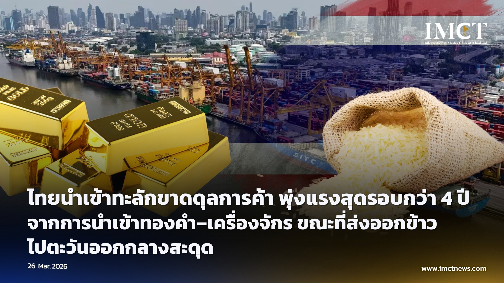 ไทยนำเข้าทะลักขาดดุลการค้า พุ่งแรงสุดรอบกว่า 4 ปี จากการนำเข้าทองคำ–เครื่องจักร ขณะที่ส่งออกข้าวไปตะวันออกกลางสะดุด