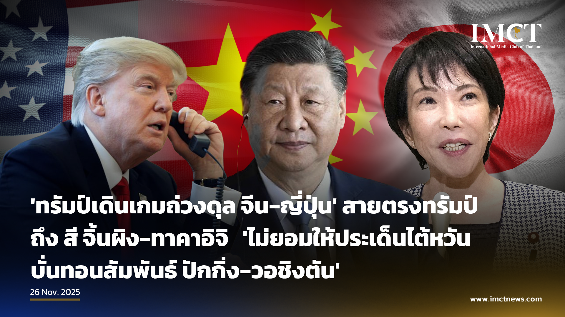 'ทรัมป์เดินเกมถ่วงดุล จีน‑ญี่ปุ่น' สายตรงทรัมป์ถึง สี จิ้นผิง‑ทาคาอิจิ 'ไม่ยอมให้ประเด็นไต้หวันบั่นทอนสัมพันธ์ ปักกิ่ง‑วอชิงตัน'