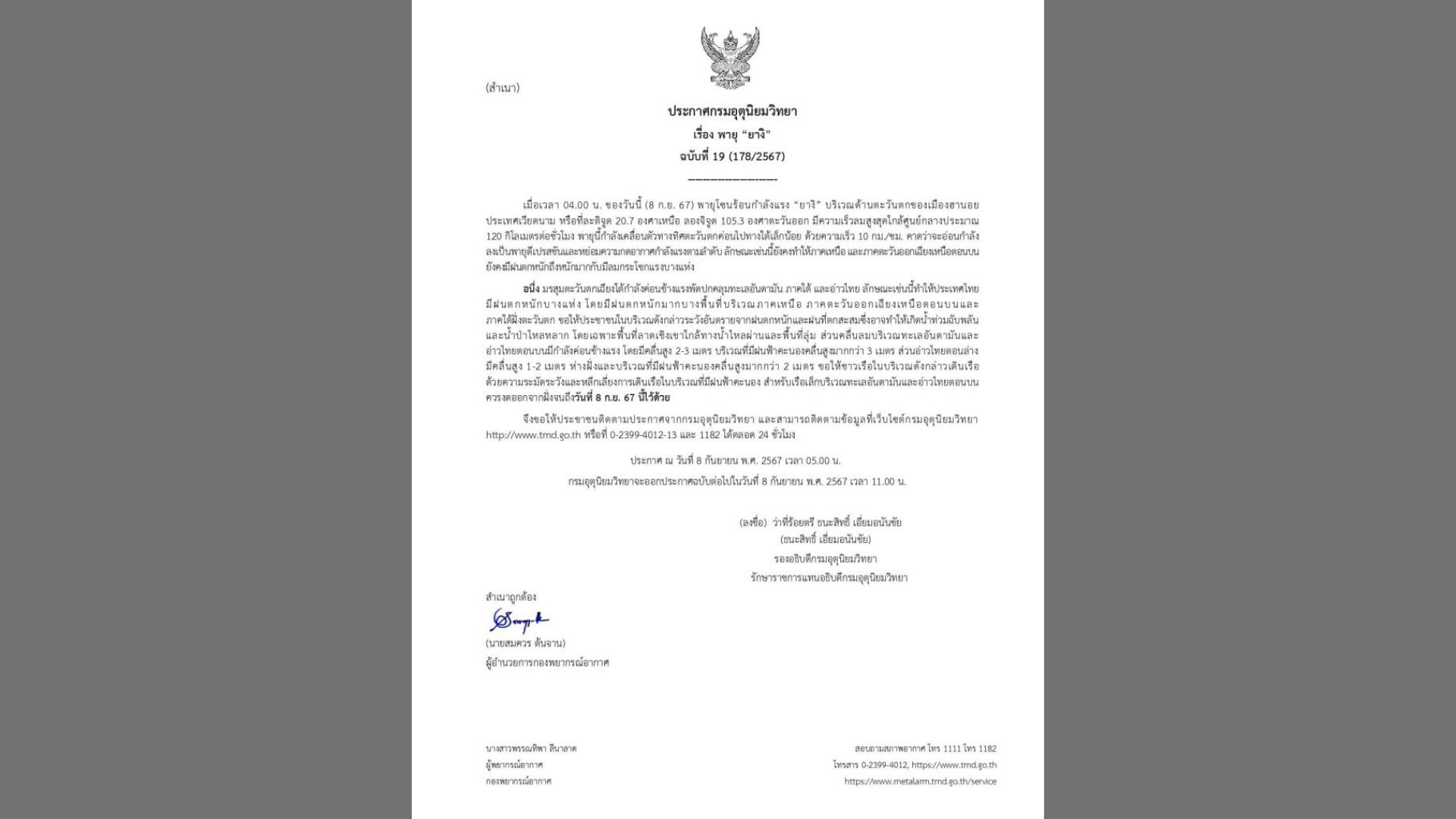 สำนักข่าวอินโฟเควสท์ รายงานว่า กรมอุตุนิยมวิทยา ออกประกาศกรมอุตุนิยมวิทยา เรื่อง พายุ “ยางิ” ฉบับที่ 19 (178/2567) ว่าเมื่อเวลา 04.00 น. ของวันนี้ (8 ก.ย. 67) พายุโซนร้อนกำลังแรง “ยางิ” บริเวณด้านตะวันตกของเมืองฮานอย ประเทศเวียดนาม หรือที่ละติจูด 20.7 องศาเหนือ ลองจิจูด 105.3 องศาตะวันออก มีความเร็วลมสูงสุดใกล้ศูนย์กลางประมาณ120 กิโลเมตรต่อชั่วโมง พายุนี้กำลังเคลื่อนตัวทางทิศตะวันตกค่อนไปทางใต้เล็กน้อย ด้วยความเร็ว 10 กม./ชม. คาดว่าจะอ่อนกำลังลงเป็นพายุดีเปรสชันและหย่อมความกดอากาศกำลังแรงตามลำดับ ลักษณะเช่นนี้ยังคงทำให้ภาคเหนือ และภาคตะวันออกเฉียงเหนือตอนบนยังคงมีฝนตกหนักถึงหนักมากกับมีลมกระโชกแรงบางแห่ง